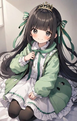 (((very longest hair))),black hair, smile,straight Hair,hair ribbon,mintgreen stripe,Black Eyes,flat chest,straight Across bangs,princess Cut, Very Long Sideburn,roundry Head,Droping eyes,,cute,Meekness,Bob Cut,long back hair,12 years Old,Kimono, giant monster,blackcat,sidekick,