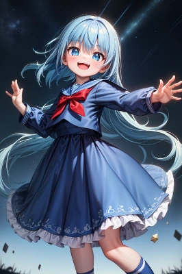 ((masterpiece, best quality, extremely detailed, absurdres)),break, (((((kid))))), Dynamic angle, dynamic pose, 1 girl, solo, thigh highs, blue eyes, long hair, food, white stockings, bow, sitting, hair bow, blue hair, blue skirt, skirt, short sleeves, shirt, blue bow, Mary Janes, looking at viewer , white shirt, blush, bangs, very long hair, indoors, puff short sleeves, puff sleeves, wrist cuffs, hair between the eyes, striped ribbon, ruffles, hands up, dress, bowtie, break,