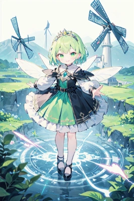 Green short hair,light green eyes,fairywing,child girl,tiara,earrings,belt,serious,magic circle,holding a electricity sword ,fighting ,wearing dress, fire,big monster ,in volcano ,lava,one knee <lora:lightline:0.65> <lora:kasshokuhada:-1> ,