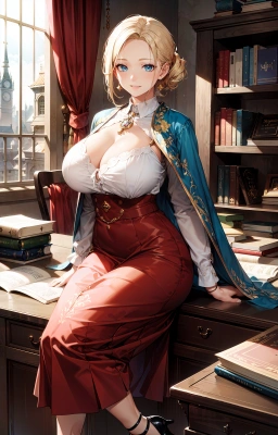 Masterpiece, best quality, highres, ultra detailed character , mature tall woman, forehead, parted bangs, chignon hairstyle, blonde hair, plump, huge breasts, medieval embroidered cape, blouse, (cleavage cutout:0.8), lace-up long skirt, heels, earrings, amulet, smile, arms behind back, holding book, leaning against bookshelf, on back, archive, warm