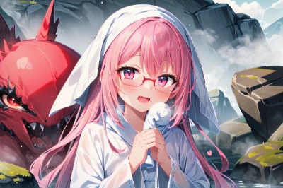 masterpiece, best quality, extremely detailed, anime, 1girl having pink eyes and pink hair wearing red rim eyeglass and simple white full body covered bathing suit, solo, (only face is visible:1.4), in the hot spring surrounding by rocks, a folded towel over the girl head, steam over, blushing and laughing, (surrounded by 10+ little monsters of capybara:1.4) , (distant view:1.4) <lora:boldline:-0.3> <lora:lightline:0.7> ,