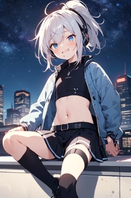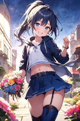 (Masterpiece, Best Quality), (Detailed and Beautiful Eyes), (Detailed Eyes and Detailed Face), (Landscape), (Highly Detailed CG, Super Detailed, Best Shadows), 8k, 4k, Beautiful Concept Illustration , (Illustration), (Very detailed and beautiful), (Perfect in every detail), Age: 16 years old, female, dark blue hair, ponytail, dark blue eyes, (gray jacket), (navel exposed), (black T-shirt), navy belt skirt, navy socks, (absolute area), garter ring, black boots, ((stands up and hands the bouquet)), (facial expression: smiling), (facial expression: joy), (big chest), headphones , (future city), (starry sky).,