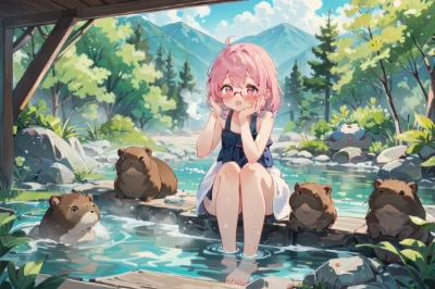 Anime, from side, A girl having pink eyes and pink hair wearing red rim eyeglass , at the hot spring surrounding by rocks, only girl’s face is sticking out of the water ,her body is not visible, a folded towel over the girl’s head, steam over, blushing and smiling , surrounded by lots of little monsters shaped capybara having yellow or blue or red eyes and long green fang