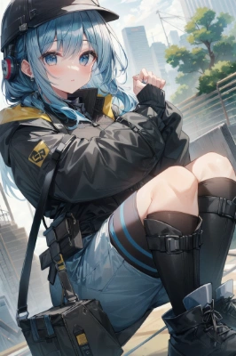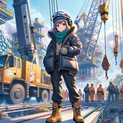 (((Masterpiece, High Quality, deep blue hair,8k, Best Quality, high resolution, close up center, 1 girl))), life-changing moment, Rikio tabi boots,boa, down jacket, construction helmet, building site, crane truck, rigging work, overcast sky, determined expression, focused gaze, gripping safety rope, steel beams, high elevation, safety harness, muddy construction boots, commanding presence, crane hook in action, heavy lifting, strategic planning, dynamic construction environment, teamwork coordination, urban development, architectural progress, blueprint consultation, protective gear, scaffolding, sense of accomplishment, busy construction workers, communicating over radio, safety first mindset, looming city skyline, industrial machinery.,