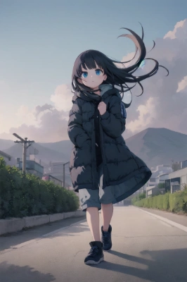 anime, girl, masterpiece, best quality, extremely detailed, wind, down jacket, black hair, blue eyes, walking <lora:deluster1:1> <lora:eyecolle_katakuri_v100:1> , wind, down jacket, black hair, blue eyes, walking, sky, watercolor, foreshortening,