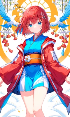 look at viewer,Wearing a red down jacket over a Japanese blue kimono, full body