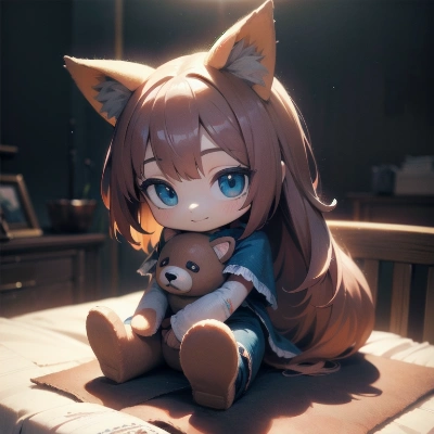 (absurdres, masterpiece, best quality, realistic), 3D, 8k, Ultra Detailed, Ultra Detailed background, Vibrant colors, transparency, full body, Very high cloth texture, studio lighting, perfect lighting, (chibi:1.4), (felt fabric:1.8), (seam, made of cloth stuffed girl, stuffed toy:1.4), 1 stuffed girl, (Cloth hair, cloth skin, cloth eyes), fox tail, fox ears, dark brown hair, mediun long hair, blue eyes, white shirt, navy blue skirt, sitting, laughing, Stuffed girl on a table in a brightly lit living room, ,