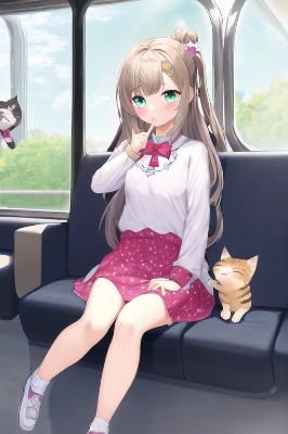 masterpiece, best quality, extremely detailed, anime, girl, <lora:flat2:-0.35> <lora:hairdetailer:0.5> mammy_girl.sitting .finger up at face in cute(cat_pattern print )(shirt) in cuteskirt .star_shapedneck. cuteaccessory . with cat. in dynamic_train ,