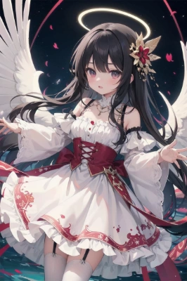 masterpiece, best quality, extremely detailed, anime, girl, masterpiece, best quality, ultra-detailed, sacred place, green meadow, rose, forest, magic circle, a cute girl, 1girl, solo, beautiful pink hair, beautiful red eyes, beautiful eyes, long hair, large breast, crown, hair ornaments, horseshoe-shaped hairband, wings, flowers, flower bouquet, ashamed,