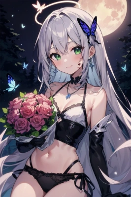 masterpiece, best quality, extremely detailed, anime, girl, masterpiece, best quality, ultra-detailed, sacred place, green meadow, rose, forest, night, moon, 2girls, 2 cute girls, underwear, beautiful silver hair, beautiful silver eyes, beautiful eyes, long hair, angel halo, flat breast, tiny breast, black gloves, crown, hair ornaments, earrings, necklace, flowers, flower bouquet, light smile, cool, butterfly, bloody, bloodstained,