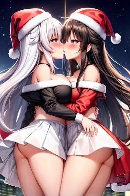 (a very cute chibi anime girl, ;1,2), ((black hair, blue eyes, large cat ears, ((sannta cosplay, red and white cloth, mini skirt, off shoulder, snowy, santa hat, standing, skirt rolled up and lifted by wind, Pencil drawing style)), red necktie, )),