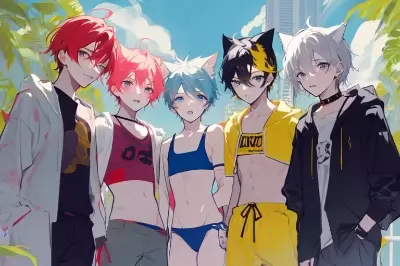 (((((male focus))))), ((boy)), ((man)),male,((flat chest)), , cool guy,good-looking guy,handsome man, Blue sky, park, dog run, cat tower, multiple boys, 4boys, Barbecue,Yakiniku, multi strapped bikini, (green hair, very short hair, pink eyes, Dog ears and dog tails), AND (yellow hair, very short hair, blue eyes, Dog ears and dog tails), AND (light blue hair, very short hair, yellow eyes, cat ears and cat tails), AND (silver hair, very short hair, red eyes, cat ears and cat tails), muscular, handsome man, bikini, harajuku fashion