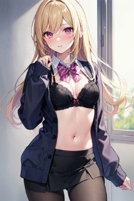 masterpiece, best quality, extremely detailed, anime, 1 girl , bobcut, brown hair, purple eyes, ((medium breasts)), <lora:hairdetailer:0.5> <lora:eyecolle_nishikigi_v100:1> ,, taste of winter, school uniform, cardigan, black pantyhose, contrapposto, thighs, miniskirt, happy smile ,show off bra,