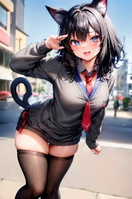 (a very cute chibi anime girl;1,2), ((black hair, blue eyes, (gray sweater), red necktie, cat ears, cat pose,zettai ryouiki, )), cat pose, highly detailed face and eyes, clearly outlined, single character, early teen, loli, european street, cleavage, leaning forward, thighs, small breasts, smile <lora:flat2:-0.4>