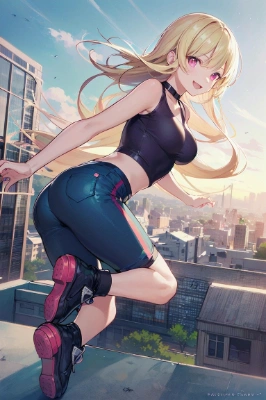 masterpiece, best quality, extremely detailed, anime <lora:flat2:0> <lora:hairdetailer:0.5> , a pretty woman, longhair, blonde hair, pink eyes, ((medium breasts)), ,((practicing parkour)),((santa claus costume)), happy smile, jumping,high building, night,