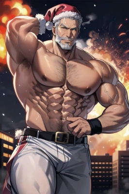 masterpiece, best quality, extremely detailed, 1 old man, male focus, solo, white beard, white facial hair, white hair, santa claus costume, Muscular Physique, Chiseled Abs, Powerful Biceps, Sculpted Chest, V-Shaped Torso, Bulging Muscles, Ripped Physique, winter, night, running, big explosion in background, a huge building is exploding in background, black smoke,,,
