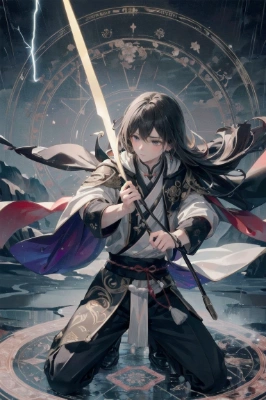 Solo, (Breathtakingly handsome young man), (Masterpiece, best quality, extremely detailed, 8k:1.4), High quality visuals, realistic, photorealistic, (Mo Dao Zu Shi), anime, diagonally horizontal side, extreme close up face, delicate and beautiful features, glowing and glossy skin, transparent white skin, (He long, waist-length hair is glossy and is let down naturally.) Kohaku Double eyelids in colored eyes. Slender and petite, slender and thin build, (slender masculine chest), slender and toned body.BREAK,A long black robe reminiscent of Taoist ceremonial costumes, with intricate silver thread embroidery on the vertical lines, collar and cuffs. He long, dark purple cloak with hood is richly embroidered with peonies and feathers in silver thread. Black pants with vertical lines reminiscent of Taoist costumes, black obi and obi-dome, black lace-up boots, and beautiful silver pendants and earrings.BREAK,A breathtakingly beautiful landscape, A thunderstorm, ((the sky covered with clouds turned pitch black. Among them, the light of the lightning creates an eerie glow, creating a mystical atmosphere in the sky:1.2)), ((Large drops of rain fall violently, shaking the ground, and the rain falls sideways with an overwhelming wind in the air:1.2)), ((A bolt of lightning appears as if cutting through the sky:1.2)), (instantly illuminating the surrounding area), In a moment of light, the scenery becomes vivid, BREAK, ((A breathtakingly handsome young man sits on a natural rock illuminated by the magical glow of a plant in a cave:1.6)), <lora:sanDka2:1> <lora:yawanuri:-1> ,