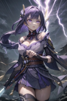 (masterpiece), (best quality),(ultra-detailed),(illustration),(extremely detailed),(perfect anatomy),(super detailed skin),(detailed),(beautiful detailed eyes),((raiden shogun),(genshin impact)),purple eyes,purple hair,bangs,long hair,braided ponytail,japanese clothes,kimono,purple kimono,off shoulder,shoulder armor,thighhighs,(engulfing lightning (genshin impact)),large breasts,cleavage,(musou isshin (genshin impact)),(vision (genshin impact)) extremely thunderstorm,extremely rain,extremely lightning,dark thunder clouds,mitsudomoe (shape),(holding polearm),(holding weapon),naginata,wet, <lora:flat2:-0.45> <lora:hairdetailer:1> ,,