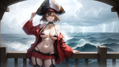 on pirate ship,thunderstorm at sea,((1girl)),looking at viewer,