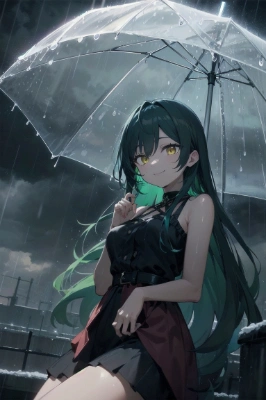 (thunderstorm),masterpiece, best quality, extremely detailed, anime <lora:flat2:1> <lora:hairdetailer:1> <lora:hadanuri1:1> <lora:hadanuri2:1> , girl, wet hair, black hair, black eyes, longhair,blushing,[Her whole body is soaked], her uniform is see-through, skirt,,