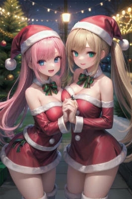 (masterpiece), (best quality),(ultra-detailed),(illustration),(extremely detailed),(perfect anatomy),(super detailed skin),(detailed),(beautiful detailed eyes),(3girls),(chibi),multiple girls,santa costume,santa hat,boots,christmas tree,, Christmas lights,(illuminations:1.3), twintail, longhair, shorthair, blonde hair, pink hair, brown hair, blue eyes, green eyes, wink, night, smile,(sparkles:1.3) <lora:flat2:-0.15> <lora:hairdetailer:1> ,