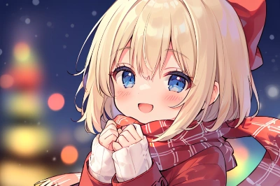 loli,blond hair,short hair,(hair bow:1.1),red bow,blue eyes,(yawn:1.2),(yawning:1.2),winter,outdoors,coat,outdoors,walking,upper body, morning, <lora:flat2:-0.7>