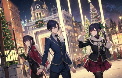 masterpiece, best quality, extremely detailed, anime, dancing maharaja,india style,Christmas lights,illuminations,multiple people, perspective, dancing, carnival, Christmas, happy, exercising,,