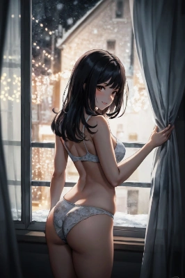 winter (nigh:1.4), Christmas Eve,indoors,(christmas tree:1.2), wooden floor,on floor,(rug:1.2),candlestand