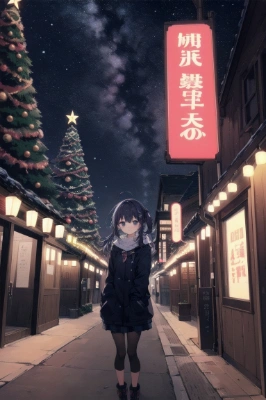 Christmas scene with a cute white 10 years old girl standing among Christmas decorations, surrounded with lots of Christmas lights, fluffy lights, holiday atmosphere, ultra-fine, digital painting, detailed lighting, sitting among green and silver decorations:2.0, twinkling lights entwined through pine branches, gleaming candles casting a warm glow over the glossy leaves and reflective baubles, holiday cheer encapsulated in the arrangement, soft-focus background with bokeh effect from distant Christmas lights, ultra-fine, digital painting, golden ratio composition. upper body, so many beautiful electric spectaculars for holy night, outside:2.0, at night:2.0, upper body, dark outside Christmas tree, lots of light with depth of field, no building, no house, face focus,