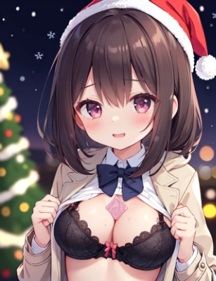 (riding on sleigh, snow, snow field, Santa Clause cosplya girl, cold, winter:1.2), white tights, legs spread, white breath, dynamic,
