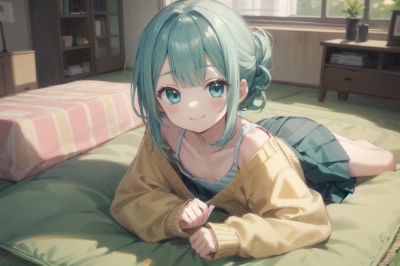 wink, masterpiece, best quality, highres, 1otoko no ko, solo, yellow cardigan, (brown pleated skirt), かわいい, flat chest, aqua hair, aqua eyes, half updo, smile, dining room, eating fried chicken, Christmas<lora:flat2:0> <lora:hairdetailer:0.5>,,,