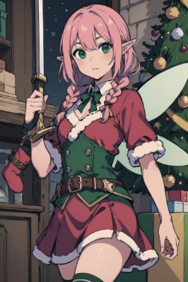 masterpiece, best quality, extremely detailed, anime, girl, skirt <lora:hairdetailer:0> <lora:sanDka2:1> , christmas eve, a pretty woman, braids, blonde hair, odd eyes, green eyes, red eyes, elf, ojou-sama, succubus, full moon, smile,
