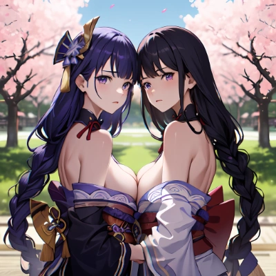 (Best quality,Masterpiece,highres,perfect lighting,)(raidenshogundef,raidenshogunrnd,black shoulder cover with embroidery,(2girl,Twins, back to back))In front of huge cherry tree,torii, temple,looking at viewer,breast,sadness,<lora:raidenshogun1:0.7>Mole at corner of eye,bare skin of back,two different expressions,1tears in eyes,1closed eyes,purple hair