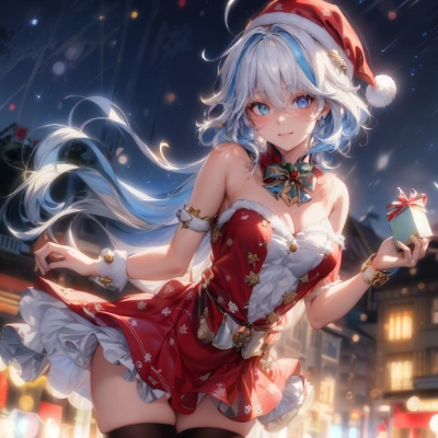 hires, cinematic angle,beautiful face,finely detail, masterpiece, best quality, ultra-detailed,Photorealistic,8k,lens flare,intense shadows,Studio,dreamy washes,bokeh photography,dreamy ambiance,beautiful detailed glow,colorful refraction,golden hour lighting,backlighting,colorful lighting,1girl, solo,cowboy shot,dutch angle,<lora:midjourney_20230624181825:0.35>,<lora:flat2:-0.5>,<lora:yaemiko1-000008:0.8>,(yaemikodef:0.5),(yae miko:1.0),(cool woman,mature female,mature,30 years old:1.1),(detailed and jewel-liked purple eyes,light pink hair,long hair,slanted eyes:1.2),(smirk:1.1),medium breasts ,looking at viewer,(holding christmas gift box,:1.2),can see one's breath,smile,(santa costume, santa dress,santa hat,miniskirt,thighhighs,:1.2),( beautiful fantasy forest ,beautiful fantasy lake:1.4),(christmas,merry christmas,christmas ornaments,christmas decorations,landscape of snow, snowing,:1.2),winter,beautiful nature,night,night sky,fantasy,fancy,cute, <lora:GoodHands-beta2:1>