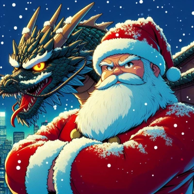 (masterpiece, top quality, very detailed, rich details and textures:1.2), anime, (1 girl, solo:1.3), (medium brown hair, straight hair, diagonal bangs:1.3), (teenager), kind expression, smile, (medium breasts), (the girl wearing a santa costume, black tights, skirt:1.4), Osaka, night, Christmas, neon, dramatic angle <lora:boldline:1> ,,,,,,,,,,,,,