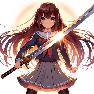 女子高生2名に剣のつばぜり合いをして欲しかったのですが難産でした。 刃が変なところから出てきたり、調整してもイマイチな画像ばかりでした。 この画像もつばぜり合いしていますが、片方が持っている小刀でぶっ刺せばいいんじゃない?と疑問が残る画像です。なんとかして消したかったけど力不足で無理でした…。