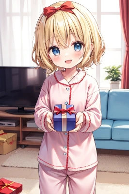 loli,blond hair,short hair,hair bow,red bow,blue eyes,christmas tree,santa hat, (summer:1),(seaside:1.2),light_smile, <lora:flat2:-0.6>