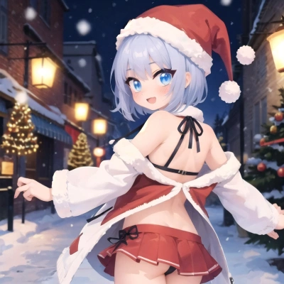 one santa girl, santa hat, red short coat, very very short red skirt, white shorts, white bra, stripped big bust, strippedbig hip, street, snow, covered snow , cute smile, backside, look back, half open mouth, short light gray hair, foreign country, illuminations, Christmas tree, night, best quality, extremely detailed, anime, girl, skirt <lora:noline:1> <lora:bigeye:1> ,