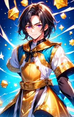 Masterpiece, high quality, super clear, super detailed, (((( male handsome man, adult age 30 years old, )))), purple eyes, cool with suspended eyes, V-shaped eyebrows, body strong and fearless 8.5 head tall, 185cm tall, well-groomed golden short hair to neck, (((bangs parted in thirds))), slender nose, facial muscles, throat, expression fearless golden fashion))), ((((clothes gold nuggets)))<lora:flat2:-0.3> <lora:hairdetailer:0.8> ,