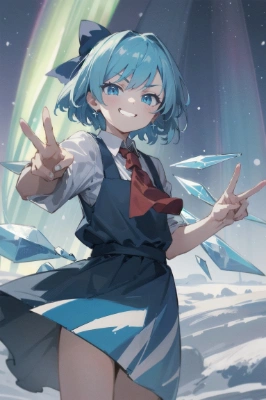 Master piece,Best quality,beautiful detailed ,ultra detailed,extremely detailed,1girl, , cirno, light blue hair, blue ribbon, red ascot, light blue icy wing, (smug face:1.2), peace sign, BREAK , (Gorgeous background), snow field, aurora sky, beautiful aurora,Blizzard,,