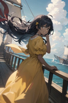masterpiece, best quality, extremely detailed, anime, a girl, princess, young lady, beautiful girl, beautiful, victorious, tomboy, smile, happy, be impressed, Latin, Spanish, dark eyes, dark skin, black hair, long hair, floating hair, (putting red ribbon on her hair), medieval, completely yellow dress, yellow classic princess dress, completely yellow flamenco Dress, long skirt, standing, wind is blowing, right hand on own right face, blue sky, sea, sailing ship, on deck, middle age, Age of Discovery, middle age,