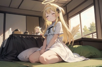 masterpiece,best quality,ultra detailed beautiful face and eyes,((((1girl sitting in a kotatsu)))),(loli),(kawaii),(((angel))),(early teen),(white_marble_glowing_skin),(round face),(((shning blonde hair))),(long hair),(closed eyes),(small_breasts),((cute holy angen wing)),((cute holy angel halo)),((cute holy angel dress)),(((a rough look))),(((cute angel room))),pantyshot,,