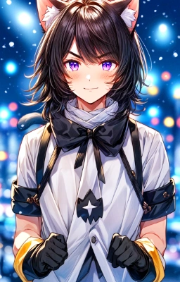 Masterpiece, high quality, super detailed, super high quality, very delicate and beautiful, female 18 years old, (((black hair two-side up to waist))), bangs to eyebrows, eyes sharp and strong glossy twinkle eyes, eyebrows glossy, eye color magenta, 6.5 head height, (((winter cat fashion, cat ears, cat gloves))), knee socks, smiling, (((Electric Illumination))), (((background cat)))<lora:flat2:-0.3> <lora:hairdetailer:0.8> ,
