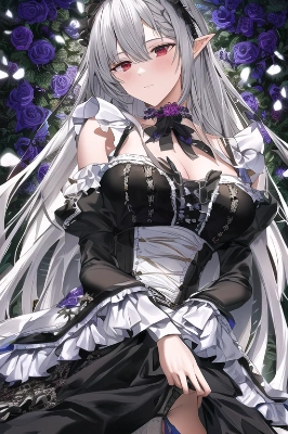 masterpiece, best quality, elf, solo, 18 years old, cat, underwear, garter belt, knee socks, black rose, too many black petals floating in the air, silver long hair, hair ornaments, red eyes, bare shoulder, Ruffled trim and frill sleeves, black rose, maid garden, upper body, navel, cowboy shot, official art, {{ultra-detailed}}, {{high resolution}}, dynamic fuzziness, intricate light, colorful, hdr, insanely detailed and intricate, hypermaximalist, elegant, ornate, super detailed