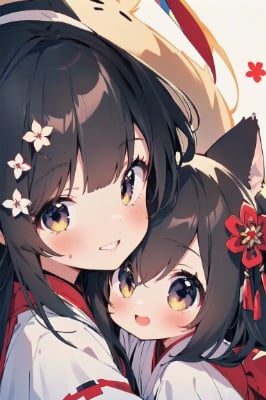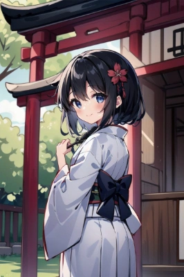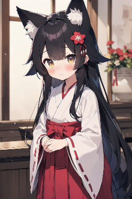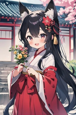 White kimono top,black eye,fox girl,black hair,little girl,shrine maiden outfit, blush, hakama<lora:flat2:0> <lora:hairdetailer:0> , flower hair ornament,wash your hands,