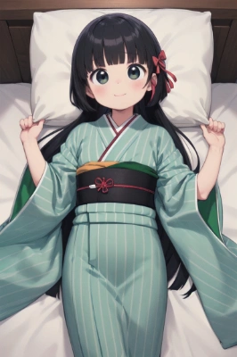 (((very longest hair))),black hair, smile,straight Hair,hair ribbon,mintgreen stripe,Black Eyes,flat chest,straight Across bangs,princess Cut, Very Long Sideburn,roundry Head,Droping eyes,,cute,Meekness,Bob Cut,long back hair,12 years Old,Kimono, subway,trip,travel,carry bag,