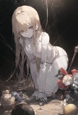female doll,cracked dolls,nude, expressionless, pale skin,ball jointed doll,marionette girl,bending her joints,hunged with strings,puppet string,puppet show,masterpiece,very aesthetic,extremely detailed,, best quality, amazing quality, very aesthetic, absurdres