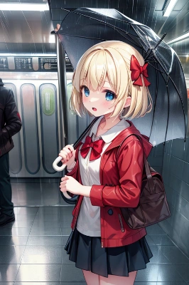 (subway:1.2),underground, subway station, 1 girl,lloli,blond hair,short hair,hair bow,red bow,blue eyes,standing,long sleeves, coat, <lora:flat2:-0.7>