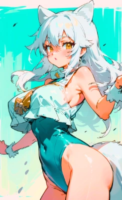 dynamic pose, cinematic angle, cinematic lighting, cowboy shot, close to viewer, smile, (masterpiece, best quality, top quality, ultra detailed, 8k, highres, HDR, beautiful detailed:1.4), (Otaku, Bisyoujo, Anime art, illustration:1.4), AzurLane, japanese_wolf_(kemono_friends), animal ears,wolf girl,wolf ears, wolf tail, open mouth, long hair, multicolored hair, brown hair, white hair, zettai ryouiki, looking at viewer, orange eyes, two-tone hair,huge breasts,