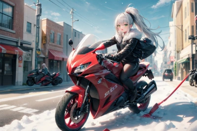 masterpiece, best quality, extremely detailed, anime, girl, rider suit women, down jacket, a pretty woman, ponytail, long sleeve, silver hair, green eyes, big sister, a black and green motorcycle, motor vehicle, motorcycle, ground vehicle, vehicle focus, winter, snow, blue sky, downtown, sunny day, cool, ride a motorcycle, driving a motorcycle <lora:sanDka2:1> <lora:sensualface_type2:1> ,
